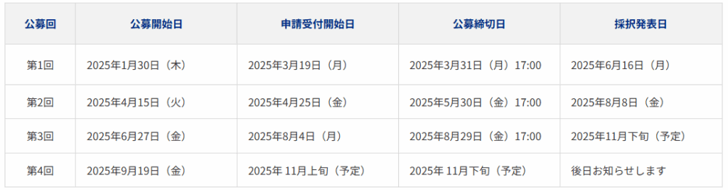 第4回公募の締め切りは11月下旬となっております。