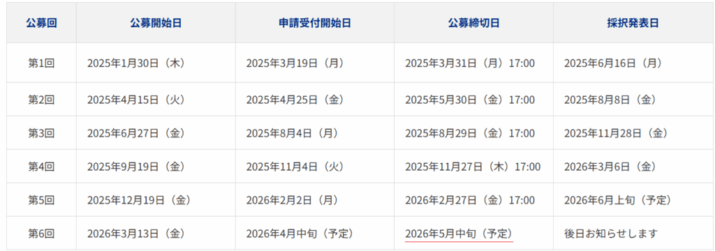 第6回公募の締め切りは2026年5月中旬(予定)となっております。
